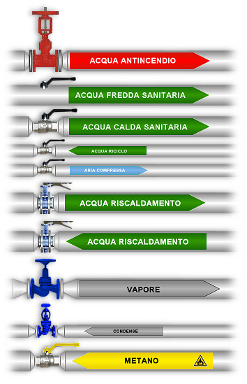 Per le tubazioni convoglianti fluidi pericolosi oltre al colore di base deve essere presente il simbolo di pericolo e il nome o la formula del fluido.